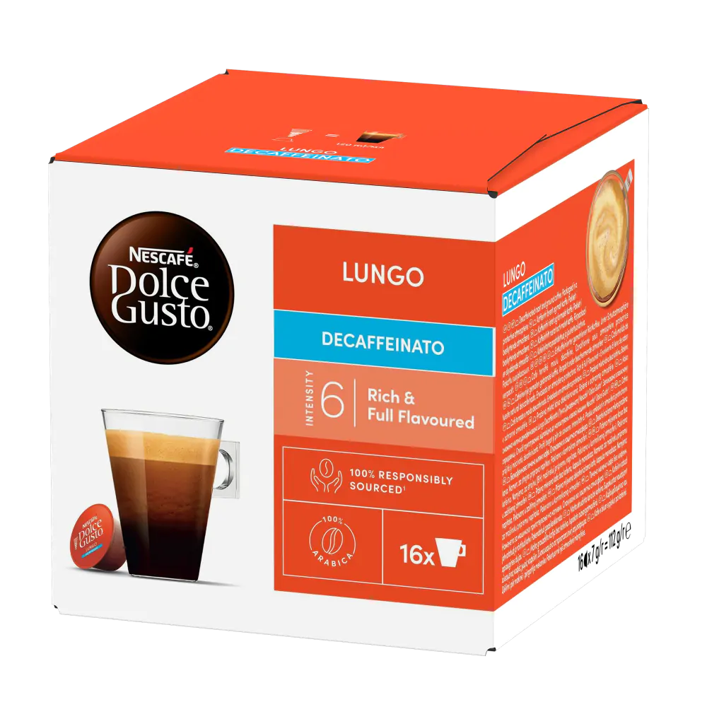 Each box contains 16 capsules for NESCAFÉ Dolce Gusto capsule machines, allowing you to make 16 cups of Lungo Decafé Blue.