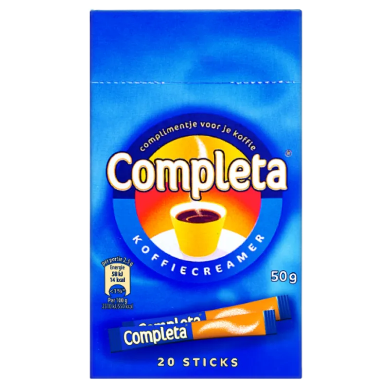 Completa Koffiecreamer 20 sticks, handige portieverpakking met 20 romige koffiecreamers. Geeft uw koffie een volle, zachte smaak zonder de koffiesmaak te overheersen. Ideaal voor thuis, op kantoor of onderweg. Lees meer