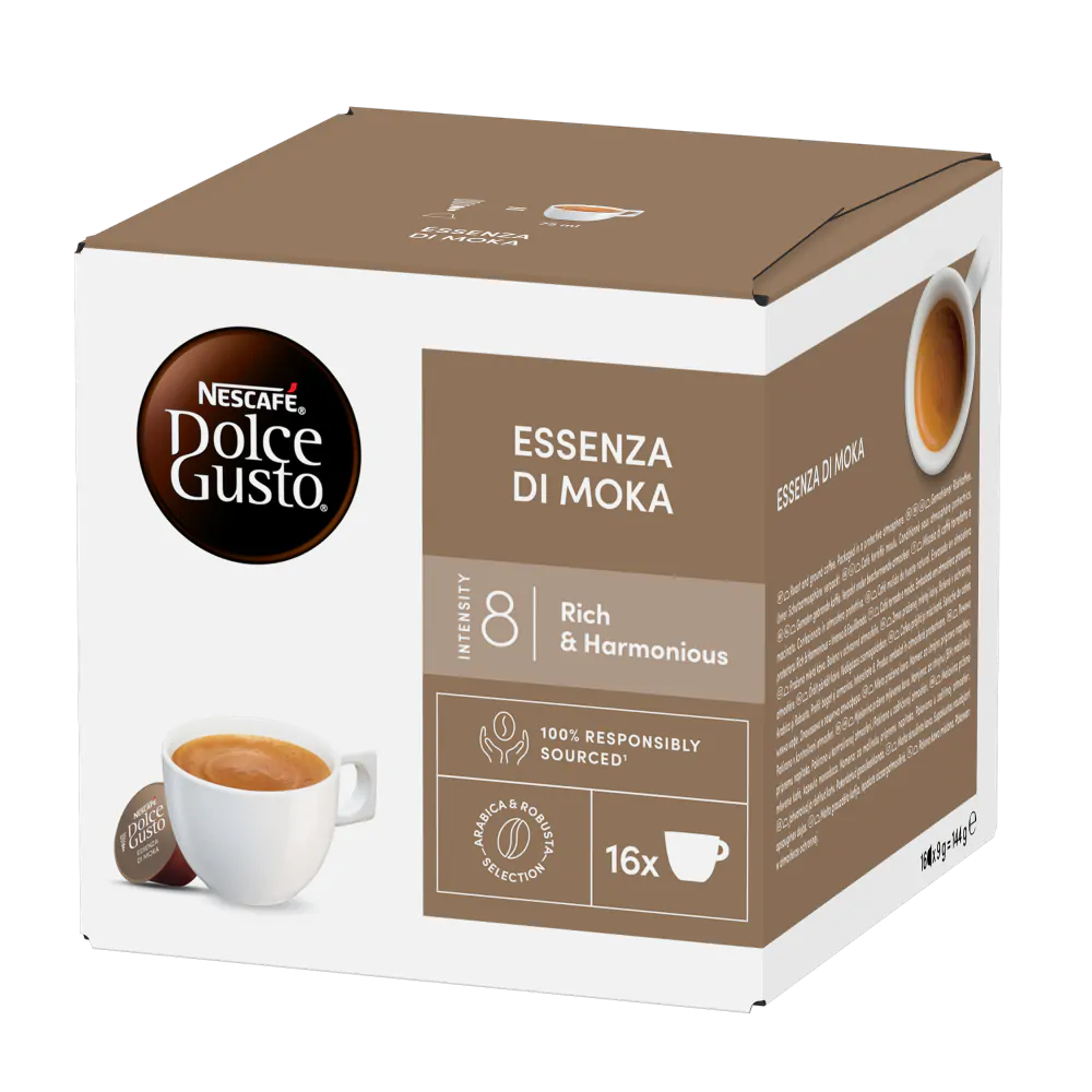 Gemaakt van een premium melange van Arabica en Robusta koffiebonen uit Colombia, Vietnam en Brazilië. Elke doos bevat 16 capsules voor NESCAFÉ® Dolce Gusto® capsulemachines, waarmee je 16 koppen Moka kunt maken.