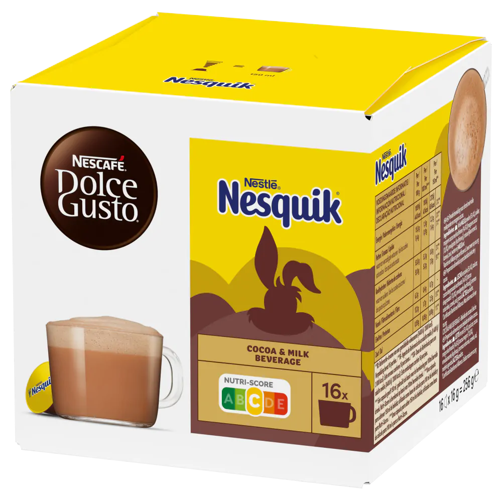 NESQUIK Dolce Gusto; de onweerstaanbaar warme cacao drank voor jong en oud!Elke doos bevat 16 capsules voor NESCAFÉ Dolce Gusto capsulemachines, waarmee je 16 koppen NESQUIK kunt maken. Lees meer